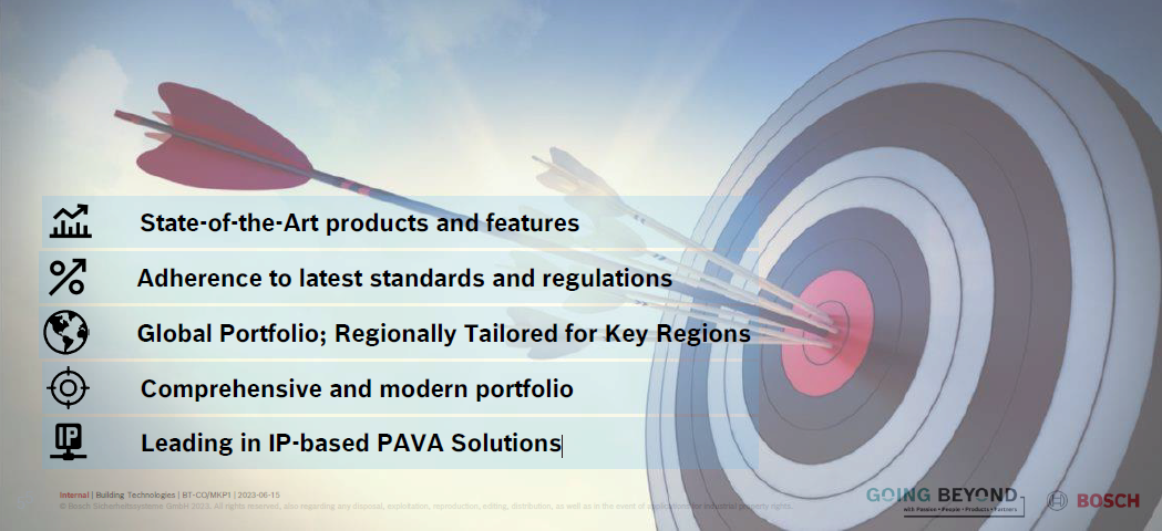 Tựu trung lại, Bosch hướng đến việc cung cấp các giải pháp âm thanh thông minh, an toàn, đáng tin cậy và linh hoạt, đáp ứng nhu cầu ngày càng cao của thị trường toàn cầu thông qua đổi mới công nghệ liên tục, cam kết tuân thủ tiêu chuẩn quốc tế và chiến lược sản phẩm phù hợp với từng khu vực, với sự nhấn mạnh đặc biệt vào vai trò dẫn đầu trong kỷ nguyên của các giải pháp âm thanh dựa trên IP.