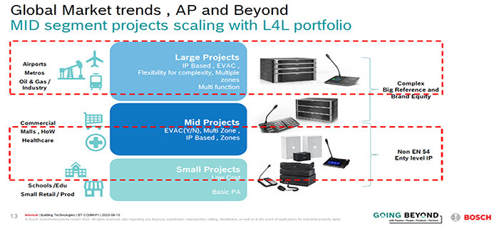 Tiếp theo là các dự án vừa, với thị trường mục tiêu là các trung tâm thương mại, khu mua sắm, và cơ sở y tế. Hệ thống cho phân khúc này thường vẫn dựa trên nền tảng IP, yêu cầu quản lý đa vùng, nhưng việc tích hợp EVAC có thể là tùy chọn tùy theo quy mô và yêu cầu cụ thể. Bosch đang đặc biệt chú trọng mở rộng (scaling) trong phân khúc này, tận dụng danh mục sản phẩm L4L (Like-for-Like) để cung cấp các giải pháp hiệu quả và cạnh tranh.