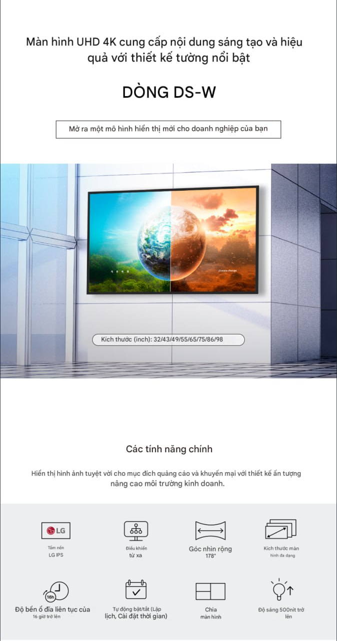 - 98 inch: cao cấp nhất, ấn tượng mạnh mẽ, tối ưu cho sự kiện lớn và trung tâm thương mại.