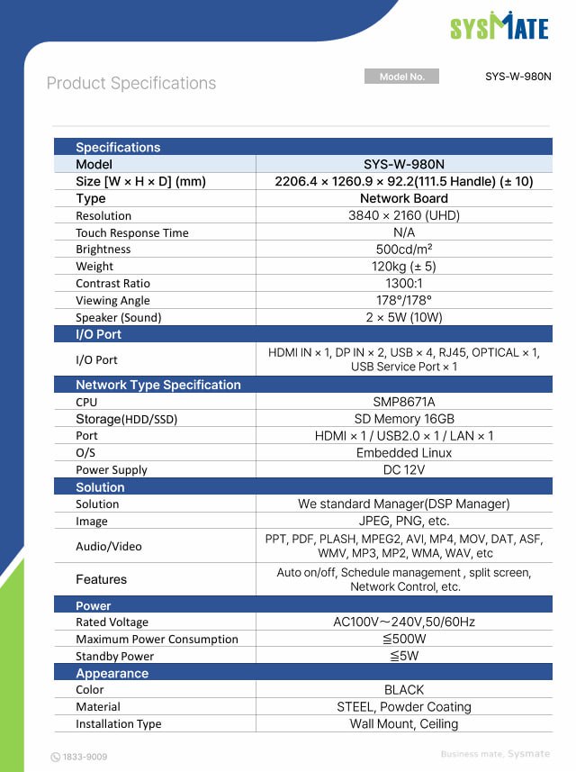 SYS-W-980N là màn hình cao cấp nhất trong dòng màn hình chuyên dụng của Sysmate – Korea với kích thước 98 inch, thiết kế sang trọng và hiệu năng mạnh mẽ. Sản phẩm phù hợp cho các không gian cần hiển thị quy mô lớn, đòi hỏi chất lượng hình ảnh vượt trội.